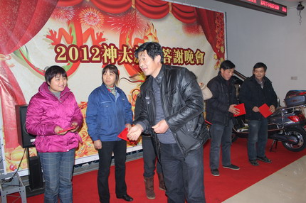2012年1月16日,神太公司舉行了一年一度的答謝晚宴,全體員工歡聚一堂,舉杯暢飲,公司對2011年度優(yōu)秀員工及干部進(jìn)行了獎勵,場面熱鬧,歡聲不斷。 公司經(jīng)歷了一年的艱難發(fā)展,依靠全體員工及各經(jīng)銷商、社會各界同仁