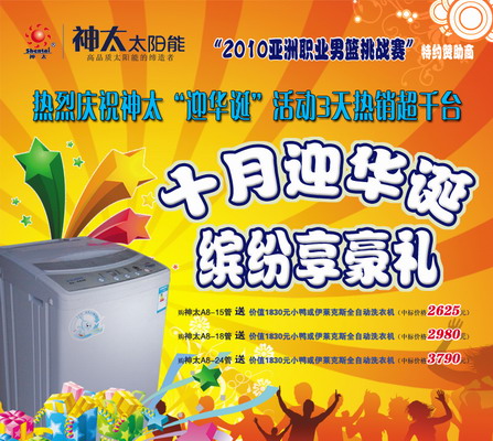 神太金秋十月送豪禮活動火爆進行 九月份以來,神太公司進行了主題為“十月迎華誕,繽紛享豪禮”的大型活動,市場反響強烈,消費者購買神太新A8系列在原價格基礎(chǔ)上除享受家電下鄉(xiāng)13%的補貼以外,還可以免費獲取4.6公斤全自