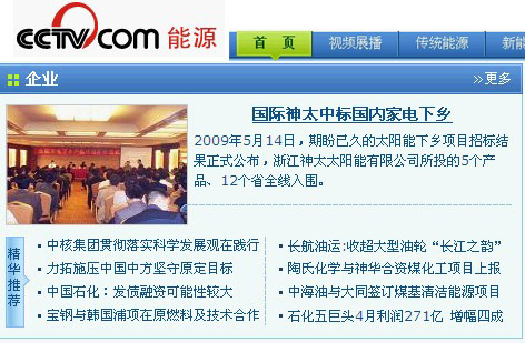 國際神太中標國內(nèi)家電下鄉(xiāng) CCTV.com 2009年06月03日 09:29 進入復興論壇 來源:央視網(wǎng) 連接地址: http://energy.cctv.com/20090603/102256.shtml 2009年5月14日,期盼已久的太陽能下鄉(xiāng)項目招標結果正式公