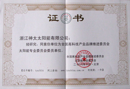 高科技產(chǎn)業(yè)品牌推進委員會中國太陽能熱水器30強品牌 北京消息:浙江神太太陽能有限公司在全國高科技產(chǎn)業(yè)品牌推進委員會組織的“2008全國太陽能熱水器30強品牌”征選活動中,順利通過相關(guān)認證,并榮獲該項榮譽?! ?jù)了