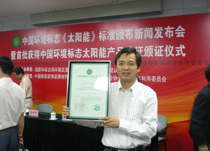 9月19日,國家環(huán)??偩汁h(huán)境發(fā)展中心召開了《環(huán)境標(biāo)志產(chǎn)品技術(shù)要求 家用太陽能熱水系統(tǒng)》和《環(huán)境標(biāo)志產(chǎn)品技術(shù)要求 太陽能集熱器》兩項國家環(huán)境保護(hù)行業(yè)標(biāo)準(zhǔn)實(shí)施的新聞發(fā)布會。同時舉行了隆重頒證儀式,向首批獲得