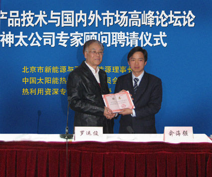 3月24日,浙江神太太陽能有限公司在海寧大酒店會議室舉行了神太公司技術顧問聘任儀式,正式聘請羅運俊教授擔任神太公司首席技術顧問。神太公司總經(jīng)理俞海強、羅運俊教授、嘉興太陽能行業(yè)協(xié)會秘書長、技術中心有關領導和技術人員出席了聘任儀式。