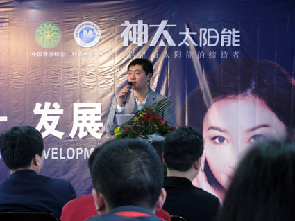 九點半,浙江神太太陽能公司總經(jīng)理俞海強先生在大會發(fā)言,俞總主要就太陽能的發(fā)展趨勢及神太公司在新品研發(fā)上作了詳細(xì)講解:神太產(chǎn)品使用了立體隔熱墻技術(shù),采用LOCK 隔熱毯技術(shù),使水箱內(nèi)膽與高密度聚氨酯發(fā)泡層之間形成360度立體隔熱保溫層;同時新產(chǎn)品采用冰箱的銀拉絲面板,產(chǎn)品制造工藝精湛、考究,引領(lǐng)行業(yè)進(jìn)入家電化生產(chǎn)工藝。在一體承壓產(chǎn)品和別墅分體機上也作了詳細(xì)闡述。俞總的發(fā)言無論是在產(chǎn)品的技術(shù)含量上還是在整個行業(yè)的前景展望上,都有很深的意義。與會的經(jīng)銷商聽的津津有味,不時發(fā)出熱烈的掌聲,使會場氣氛推向高潮。