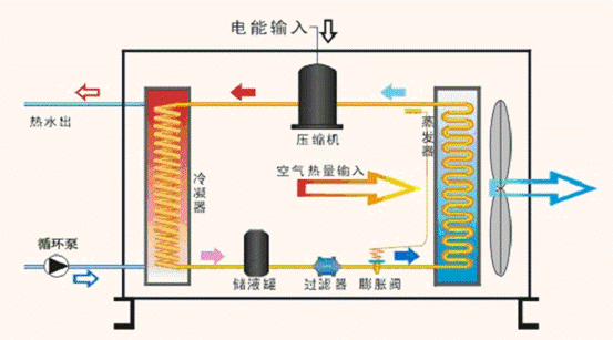 空氣源熱泵熱水器就是利用逆卡諾原理,通過介質(zhì),把熱量從低溫物體傳遞到高溫的水里的設(shè)備。它主要是由壓縮機、熱交換器、軸流風(fēng)扇、保溫水箱、水泵、儲液罐、過濾器、電子膨脹